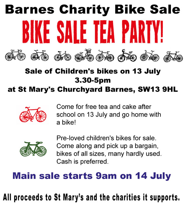 Bikes are being taken in on Sat 7 July 10- 12, and Thursday 12 July 1-6pm. Or you can arrange to have them collected via tiptapp, a new moving service. Please see www.stmarybarnes.org/bikes or facebook.com/barnescharitybikesale for all details and FAQs.