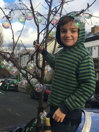 Festing Road in Putney is taking Christmas very seriously. Every one of the twenty two trees which line the street , which goes down to the Thames, has been decorated. The idea came when three year old Lila Tate asked her neighbour Hugh Thompson a few weeks ago, whether Santa was coming this year.