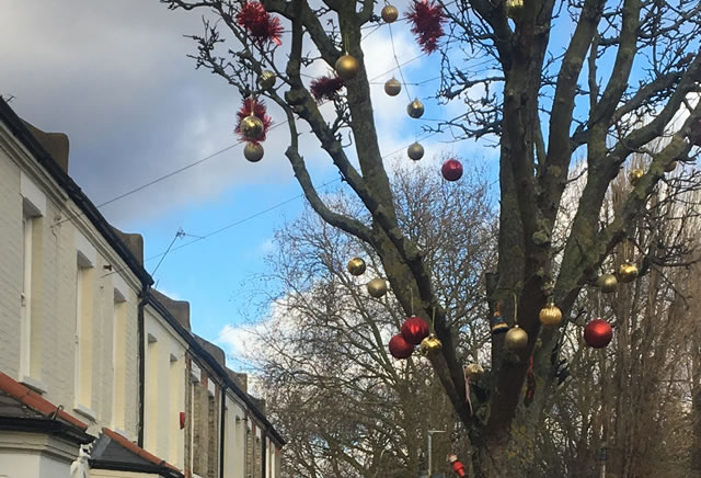 With all the activity- lights, baubles, model robins, gilded barbie dolls and traditional tree decorations going up, the street which in the summer is famous for its blooms now has another reason to be proud. Since every tree has been individually adopted, each tree decoration is different. A wide range of creative talent has been exposed.