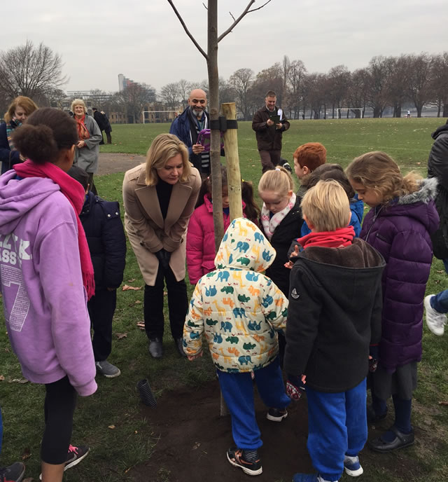 Friends of Wandsworth Park & The Putney Society planted two Tulip Trees today (2nd December) in Wandsworth Park. They were planted to commemorate the Queen's 90th Birthday and were assisted by Putney MP Justine Greening and over 60 children from Brandlehow and The Roche Schools.