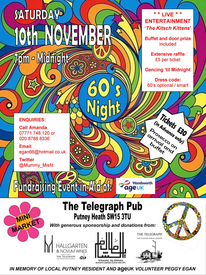 Have a great night while raising money for Age UK, Wandsworth in memory of Putney resident Peggy Egan.