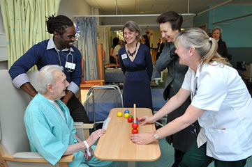 On Thursday 11 December 2008 the Princess Royal visited in her capacity as Patron of the College of Occupational Therapists and has a special interest in the work of the ward, which offers a unique training opportunity in an elderly care and rehabilitation setting for health professionals training at Queen Mary’s. By providing a ‘real-life’ clinical-based learning experience for medical, nursing, physiotherapy and occupational therapy students, the programme allows them to develop their own unique professional skills, whilst working and learning together as an integrated professional team. During the course, students are jointly responsible for patient care and decision-making. During the visit, The Princess Royal met second and final year placement students together with the facilitators and staff who support them throughout the course. Individual and group therapy activities formed part of the Royal tour, giving medical and nursing students the opportunity to demonstrate their understanding of the therapy role in patient rehabilitation. Sally Hale, Head of Older People and Neuro Rehabilitation Therapies/Occupational Therapy Professional Leader, Queen Mary’s Hospital said, “The Princess Royal’s visit gave us a wonderful opportunity to showcase the work of students and our staff and demonstrate exactly what has been achieved and learnt over the last five years as a result of partnership working between healthcare professionals in practice and education. The Princess Royal spoke to every student, patient and member of staff presented. There was a real sense of occasion for everyone and judging by all the smiling faces, I’m sure that there will be many happy memories too.”