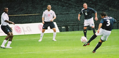 I thought the rain had clouded my vision when I saw Ally McCoist run past Ben Johnson the Canadian athlete who ran the 100m in a world record time of 9.79, as if he was standing still. Kielty who was now growing in confidence expertly saved the resulting shot. The crowd was cheering ironically everytime Kielty managed to catch the ball.McCoist, under the watchful eye of his fellow ITV pundits soon added a second to his goal tally with a well taken goal just inside the area. 7-1 It was again Gianfranco Zola’s magical feet that created the ROW’s second goal. After skipping past several lunging challenges he proceeded to curl the ball from 18 yards out into the far corner of the goal. The Italian master has still got his touch and this performance would grace any great stage. The final whistle blows and the scoreboard unbelievably reads ‘ Scotland 7 – 3 Rest of World’. As the players are due to come back onto the pitch to sign autographs, Craven Cottage is engulfed in an Arctic style downpour of hailstone and rain. June 1, 2006