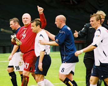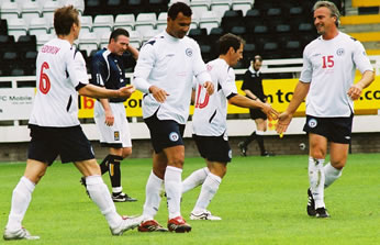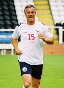 A windy rain swept Craven Cottage couldn’t dampen the spirits of the crowd, eager to catch glimpses of their heroes battling in this ‘friendly’ warm up match. I’m sure I could hear the distant sounds of the droning bagpipes as 11 William Wallaces lined up against the Rest of the World team consisting of many legendary names in football. My predictions of a Rest of the World victory were soon dashed when Gordon Durie opened the scoring against a hapless Patrick Kielty within 2 minutes. The ever young Gary Mcallister soon added a second goal in what was looking to be a one sided game.