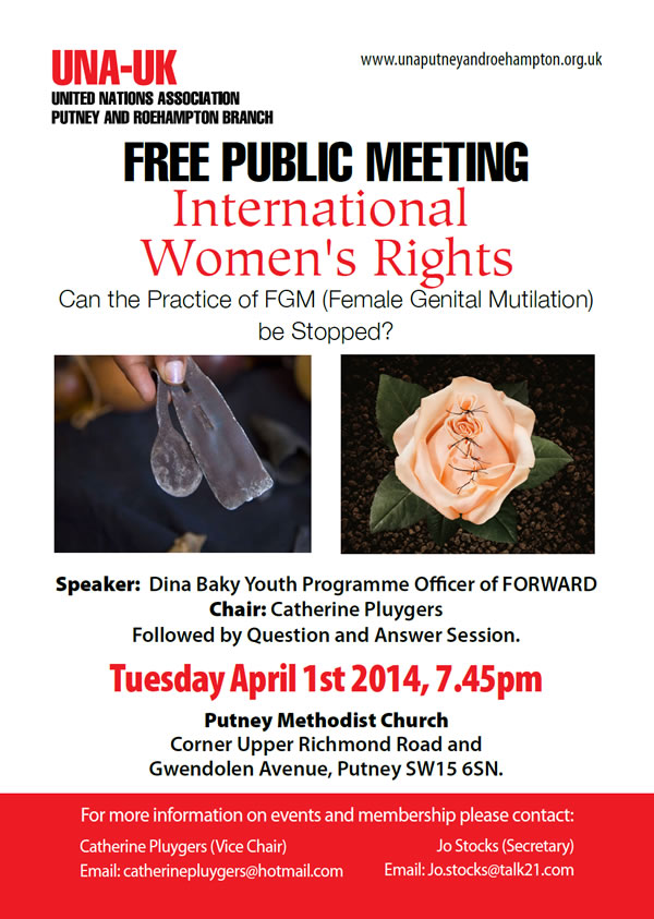 FREE PUBLIC MEETING 'CAN THE PRACTICE OF FGM BE STOPPED?' on TUESDAY 1st APRIL 2014 at 7.45pm at PUTNEY METHODIST CHURCH, PUTNEY, SW15 6SN SPEAKER: DINA BAKY - YOUTH PROGRAMME OFFICER of FORWARD |