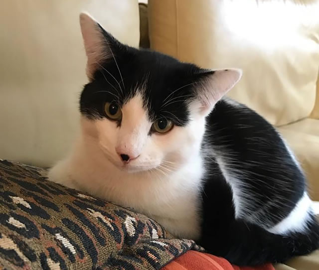 He is chipped and 8 months old, knows his name and loves his food. Timid but friendly cat. He has a white chest with a black heart shaped marking.