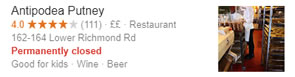 Antipodea on the Lower Richmond Road appears to be closed forever. Following comments on the forum we emailed the group and restaurant several times in August and this month, but as yet have not received a response, but a search on google states closed.
