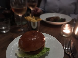 The main courses arrived; my friends shrimp burger (£16) came with fries which were really hot and not at all greasy, and topped with a fiery 'mayonnaise' and my guinea fowl melted away from the bone and was served with a rich prune and madeira jus with cauliflower puree and green beans(£18).