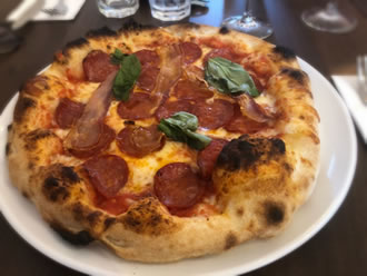 The Americana pizza (£10.50) was light and fluffy with traditional salami with fresh basil and tasty smoked pancetta. Our only comment would be a pizza cutter would make it easier to eat if we were being picky!