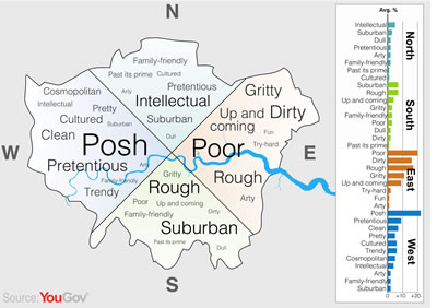 reveals the stereotypes people associate north, south, east and west London with and the results have been published in the form of a map: