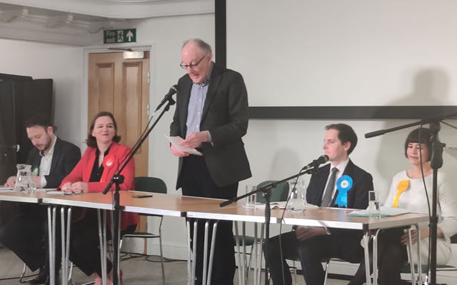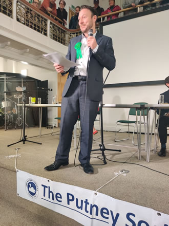 The Community Church in Putney was packed this evening when around 250 people attended the General Election Hustings organised by The Putney Society. The Society membership had indicated four broad areas, in addition to Brexit, on which they wanted to hear the candidates views; Climate Emergency, the lack of a “Remain” alliance in the constituency, Adult Social Care and the need for Food Banks. The Hustings Chair, Jonathan Callaway, read these out at the start of the meeting before each of the four candidates spoke for 6 minutes. The candidates drew to decide the order of speaking: Sue Wixley (Liberal Democrat), Will Sweet (Conservative), Fleur Anderson (Labour) and Fergal McEntee (Green) The candidates statements were followed by a 12 minute session for each answering questions from the floor. These ranged from general topics such as the climate emergency through Brexit to local issues and included questions around tactical voting. The large attendance and lively debate reflects the high interest in the election in the Putney, Roehampton and Southfields constituency.