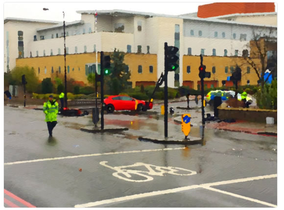 The motorcylist involved in a crash on Roehampton Lane on Monday has died in the early hours of this morning (10 January). The man in his early sixties was in a collision with a car at the entrance to Queen Mary's Hospital shortly before 9.20am. He was taken to a south London hospital by London's Air Ambulance in a critical condition before he died. Delays continued as the road remained closed while the police conducted tests and reconstructions of the accident. This increased the already substantial amount of traffic disruption in the earlier resulting from the tube strike. The unusual quality of the image above is according to the police 'purposely taken to retain integrity of investigation and identity of vehicles'.