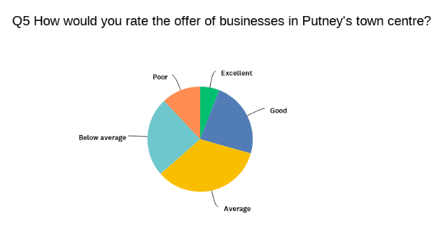 Overall, 63% of respondents rated the town centre offering was average or better but the main gripes were traffic issues and the number of vacant units. Strengths were seen as the riverside location and excellent transport links. Positively Putney says these are two complex issues that require multiple stakeholders to work together to make a change. It expressed pessimism that Hammersmith Bridge would ever reopen and said that it will work with partners to reduce the amount of traffic coming down the High Street to get into central London.