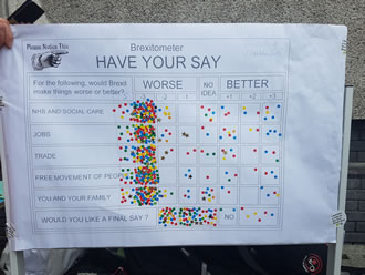 On Saturday 28 October the Wandsworth branch of the European Movement (EMW) set up stall by Putney Market, with the Brexitometer taking centre stage. The Brexitometer is a chart with a number of questions, where people are invited to put a sticker to show if they think life will be better or worse after Brexit. Organisers told this website: "In no time at all, passers-by were queuing up to make their mark".