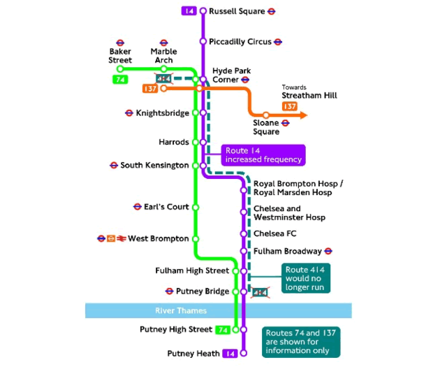 TfL says, “ If route 414 no longer ran, route 14 would be enhanced to help ensure there is sufficient bus space for customers that need it, including at the busiest points along the route and at the busiest times of the day. “Route 14 would continue to operate between Putney Heath/Green Man and Russell Square, however it would run approximately every eight minutes Monday to Saturday daytimes, instead of every ten minutes. On Sundays and all evenings, it would run approximately every ten minutes, instead of every twelve minutes.”