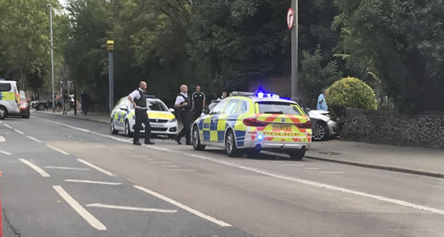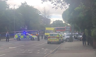 Putney Hill was closed in both directions to traffic. Numerous police cars and a London Ambulance Service (LAS) vehicle were on the scene.