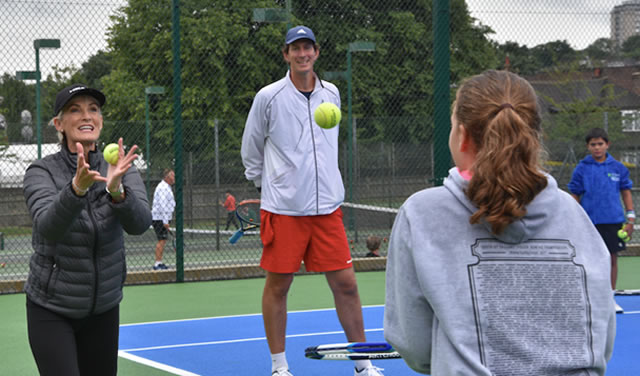 Playing and coaching for so many years in Scotland have made Judy Murray very resilient – you might even say waterproof. And that’s certainly what she needed to be when she dropped into Southfields Lawn Tennis Club this afternoon, lured – as she later tweeted – perhaps also by prospect of cake. “When your reputation precedes you.......'if you open our new courts at Southfields TC, we will provide cake'. Sold.” After so much hot and dry weather this summer, it turned out to be an even more dismal afternoon than even the most pessimistic forecasts had predicted. But, to the – over one hundred – club members and their families who came along today, the sun didn’t need to shine. It was an uplifting community event made all the more special by the presence of a true tennis great. Judy took time out of her hectic schedule to help the Southfields Lawn Tennis Club to celebrate the official opening of two brand new tennis courts at the club. Built with the support of the LTA, the LED-floodlit courts replace two out-of-condition grass ones, opening up new playing capacity for members all year round. The coaching session over, everyone gathered under umbrellas on the upper-most court to hear SLTC’s chairwoman Caroline de la Soujeole say a few words of thanks first to Judy and the event organisers for making the day so special and then to the LTA and the committee members involved in driving the court conversion project itself to its successful conclusion.