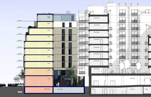 After years of granting planning permission for whatever massive and obstructing building was proposed, the Council seems suddenly to realise that there might be time to moderate the expansion. However, recent refusal such as Homebase (Swanden Way) and Osiers site, along with this one in Putney, have all be turned over and granted by either the Mayor of London or Appeal procedure. Is the Council getting back, as a boomerang, the result of their loose policies? An application to redevelop the corner of Putney Bridge Road and Putney High Street was submitted around the same period (but not yet decided) for erection of a mixed use development of between seven and ten-storeys to accommodate retail, offices and hotel (p.a. 2017/5724) - see image below. The Putney Society objected: “This scheme [extends] the same excessive height around the corner and on to the High Street, where buildings opposite within the Embankment Conservation Area are just four storeys, and any excuse about matching Jubilee House becomes irrelevant. “ However, in view of the approval of the scheme around it (described above), the battle is definitely lost. Cyril Richert |