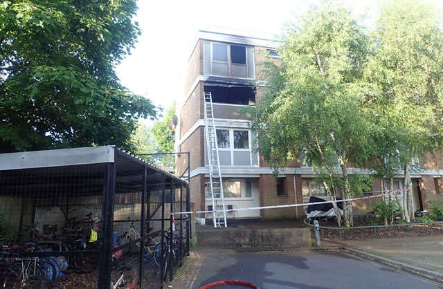 Four fire engines and around 25 firefighters were called to a fire at a flat on Evenwood Close in East Putney in the early hours of Saturday (9 May) morning. Part of the five roomed flat on the second floor of the building was damaged by fire. A small part of the balcony of another flat on the second floor was also damaged by fire. Two men had left the building before the Brigade arrived and they were treated on scene after suffering from smoke inhalation. Fire crews came from Wandsworth, Fulham, Battersea and Chelsea fire stations - the cause of the fire is under investigation.