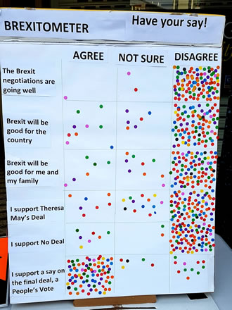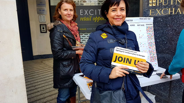 A team from the Wandsworth Liberal Democrats were out on Putney High Street on Sunday gauging the local mood on Brexit through their Brexitometer poll. There were many animated and friendly discussions at the stall, which was set up outside Putney Exchange for a few hours from midday. The Lib Dem team organised the session ahead of what is expected to be another dramatic week in Parliament, when MPs are set to vote on Theresa May’s proposed deal. Over 100 respondents shared their views on the current situation and what they think should happens next on Brexit. People cast their ‘vote’ by placing a coloured sticker in their chosen column on the chart. Respondents expressed their worries about the Brexit talks and the possible impact Brexit. Around 97% of respondents disagreed with the statement: “the Brexit negotiations are going well”, with only 3% saying they agreed or were not sure. The vast majority of people disagreed with the statements “Brexit will be good for the country” and “Brexit will be good for me and my family”, with more than 8 out of 10 people saying they disagreed (or 86% and 85% on the respective questions). Respondents also shared their views on the options of the Prime Minister’s deal versus leaving the EU without a deal or the choice of a popular vote. Again, the results were conclusive. Only 6% of respondents supported Theresa May’s deal and a similar percentage opted for No Deal with the EU. Almost 7 in 10 people (68%) of people support having a popular vote on the final deal. The Brexitometer showed that, overwhelmingly, local people are concerned about what Brexit would mean for the country, as well as themselves and their families. The vast majority of respondents believe they should have the opportunity to vote on the final agreement, a People’s Vote. |
