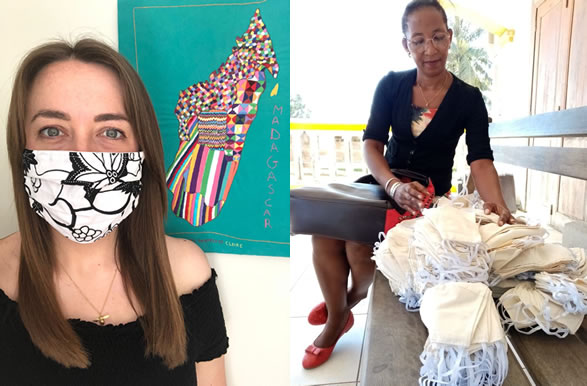 Hazel Jupp models one of her masks - Masks ready to be distributed in Madagascar