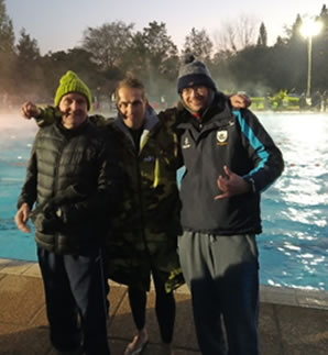 Having set up a tent on the Friday evening, the atmosphere and camaraderie around the pool was fantastic. The weather Gods were very kind to the swimmers, beautiful warm 24deg C sunny weather during the day, gave way to very cold clear night skies lit by full moon. Night time temperatures were difficult to deal with (pulling on a wet costume in darkness in 6deg C temperatures is not much fun, and getting into the 19deg C water was in fact a relief at 4am!!).
