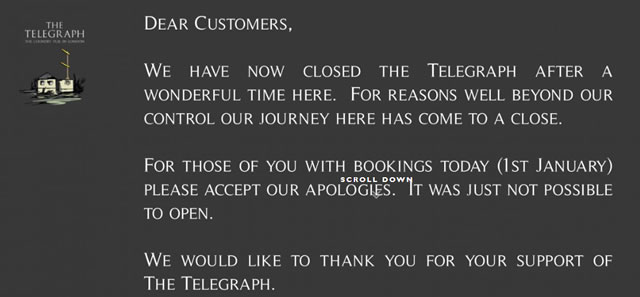 Customers who had booked a table for a New Year's Day meal were disappointed yesterday when they turned up to the Telegraph to find the doors locked. The pub has closed due to reasons "well beyond our control" according to the website. The owner of the pub on Putney Heath says it was a failure to agree on new rent levels with the freeholder that led to the shock closure. On 28 November the pub tweeted about their sold out wine tasting event, however the next tweet on 31 December announced its closure: