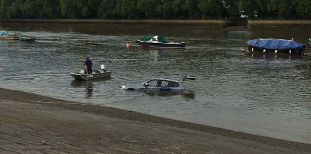 For some reason BMW's seem particularly susceptible to being caught by high tides on Putney Embankment. Yesterday (21 July) a BMW that had been unwisely parked on the slipway was seen floating away pulled by the high tides that are expected to continue until 25 July. |