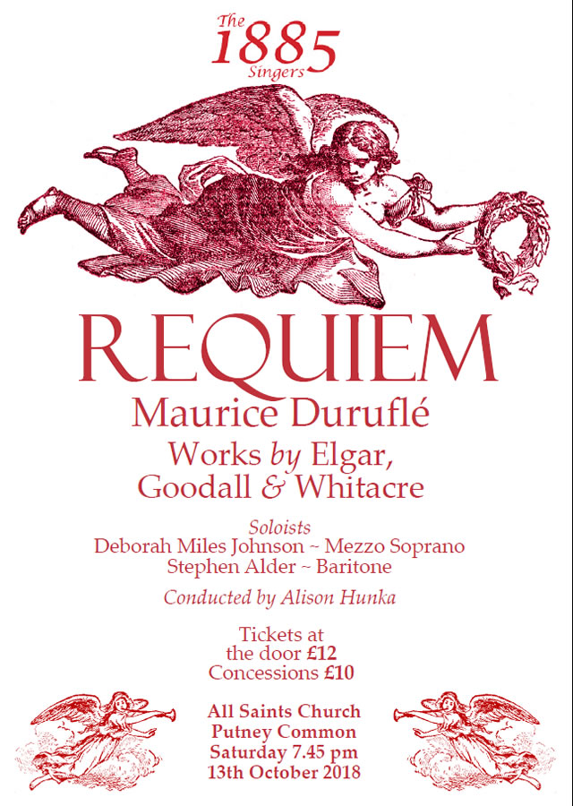 On Saturday 13 October t he 1885 Singers will be giving a performance of Maurice Duruflé's setting of the Requiem. This beautiful work is often compared to the Faure which was composed in France half a century earlier. Also in the programme are works by Elgar, Goodall and Whitacre. Tickets at the door. £12. Concessions £10 Children free. Alison Hunka founded the 1885 Singers in 1997. It is a Putney choir open to everyone, it has established itself in the music scene of South West London. They give four concerts a year, usually March, June, October and December. There is a 4-6 week lead into each concert with rehearsals on Mondays and Thursdays in All Saints Church , Putney Common. For more information pcontact Alison Hunka by email or on 020 8788 1031.