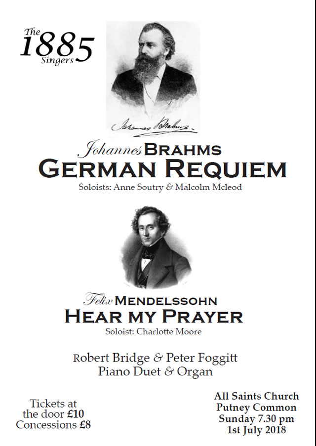 On the 1st July in All Saints Church Putney Common 7.30 pm The 1885 Singers will perform Brahms' German Requiem and Mendelssohn's beautiful 'Hear My Prayer' which includes the famous song 'O for the wings of a dove'. Accompanied in the original piano duet version played by Peter Foggitt and Robert Bridge and conducted by Alison Hunka this is going to be an occasion to be remembered.