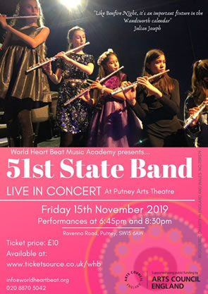 Join the 51st State Band live in concert at Putney Arts Theatre, Friday 15 November for an evening of exceptional musical talent from the students at the World Heart Beat Music Academy. The 51st State Band, the flagship band of World Heart Beat Music Academy, was conceived by Founder and Artistic Director Sahana Gero MBE in 2000. With boundless energy the band represents the spirit of World Heart Beat by bringing young musicians of all ages, backgrounds and abilities to learn and play together. Now performing in its 20th year at Putney Arts Theatre, like Bonfire Night, it has become a festive event in the Wandsworth arts calendar. It is a chance for the band to really shine and showcase the vitality and dedication that students of the World Heart Beat Music Academy thrive on. A selection of jazz and film scores will be performed by seventy plus young musicians creating an upbeat musical extravaganza for all those attending. The concert will host the Jack Petchey Awards which recognises our outstanding young people (aged 11 –25 years). Founder and Artistic Director, Sahana Gero MBE said: “We are delighted to be at such a charming venue once again. Putney Arts Theatre is a jewel in our community and also has a large enough stage to host our band! At World Heart Beat we are delighted to be celebrating 20 years since the 51st State Band’s inception. The energy and joy is ever present and we look forward to bringing you a beautiful choice of music, fantastic singers, a host of incredible musicians and a truly inspiring and wonderful evening.”