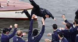 With over 7.6m tv viewers and thousands lining along the course there was an epic battle over the first half of the course, with Cambridge stealing a brief lead after Hammersmith, Oxford regained the initiative and moved steadily away to their third boat race victory in five years. Early forecasts of a south-westerly breeze brought back memories of the Cambridge sinking in 1978, but when the wind backed round to the south-east the towpath talk instead centred on the possibility of a wind-assisted record to the Mile. But neither prediction was fulfilled. Cambridge won the Toss and chose the safe option of the Surrey station, but as the crews powered evenly off the Start it was Oxford who took a narrow lead. Two minutes into the race the Dark Blue cox, Nick Brodie, was warned for his steering by umpire John Garrett as the tips of their blades drifted dangerously close. But the leaders could not use the early Middlesex bend to its full advantage as the Cambridge used their higher rate of striking to good effect and stayed well in touch. Oxford were the first to reach the Mile in 4 min 9 secs, less than a second clear, and then mounted a serious challenge to move ahead and deny Cambridge the advantage of the Hammersmith bend that was about to swing in their favour. But Cambridge, with their stroke Ryan Monaghan still pushing them along at 36 strokes a minute against Oxford at 34, refused to go away, mounting a push of their own which saw them draw level for the first time. The Light Blue momentum was maintained all the way to Hammersmith Bridge which Cambridge reached one second ahead in 7 mins 34 secs With the Hammersmith bend continuing to unwind in Cambridge’s favour they briefly took a 2/3 length advantage but then Oxford raised their game for what was to prove the killer blow. Raising their rate to 36 strokes a minute, two pips higher than the opposition for the first time in the race, they launched an attack to which the tiring Cambridge men had no response. At Chiswick Steps, where the time was 17 mins 16.5 secs the three second margin equated to a full length in Oxford’s favour.