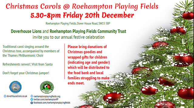 Following the resounding success and fantastic attendance at last year’s event, the Doverhouse Lions* and Roehampton Playing Fields Community Trust+ are holding another Christmas carols community evening. This will take place at Roehampton Playing Fields, Doverhouse Road on Friday 20th December from 17.30 to 20.00. There will be traditional carol singing around the Christmas tree, accompanied by members of the Thames Philharmonic Choir, with refreshments served and a special visit from Father Christmas. The festive community event is family friendly, open to all and free of charge. If guests are able, they are asked to bring donations of Christmas goodies and wrapped gifts for children (indicating age and gender) which will be distributed to the food bank and to local families struggling to make ends meet. Members of the Trust and the Lions will be on hand to share the progress that has been made over the last year, such as the big spruce up of the pavilion, to discuss their plans to safeguard the future of the Playing Fields and to explain how local people can support the campaign for the Playing Fields to be run by the community for the community. Don’t forget your Christmas jumper! *