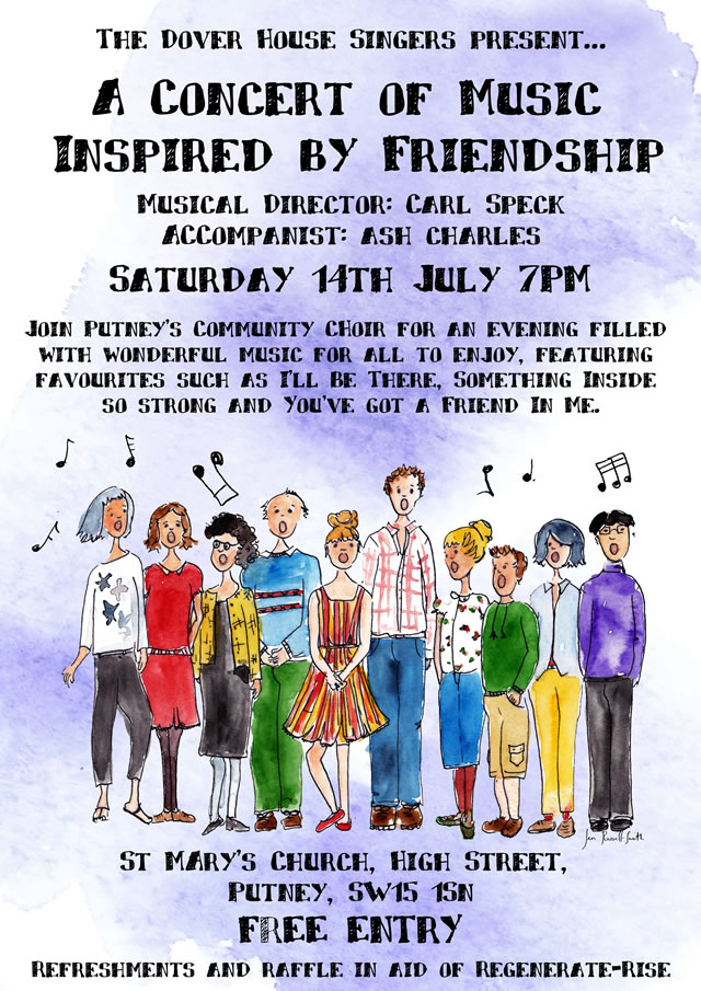 Putney's Community Choir Dover House Singers invites you to their free Summer Concert (songs about friendship) on Saturday 14 July at 7pm at St Mary's Church, Putney SW15 1SN. Dover House Singers sing a really wide range of songs and pieces – from pop songs to spirituals and plenty more in between. The hold two big concerts like this one a year, with several smaller performances dotted through the calendar. They are led by Carl Speck, their musical director who also teaches at a nearby school. Although they rehearse in a church hall, they are not a religious choir.