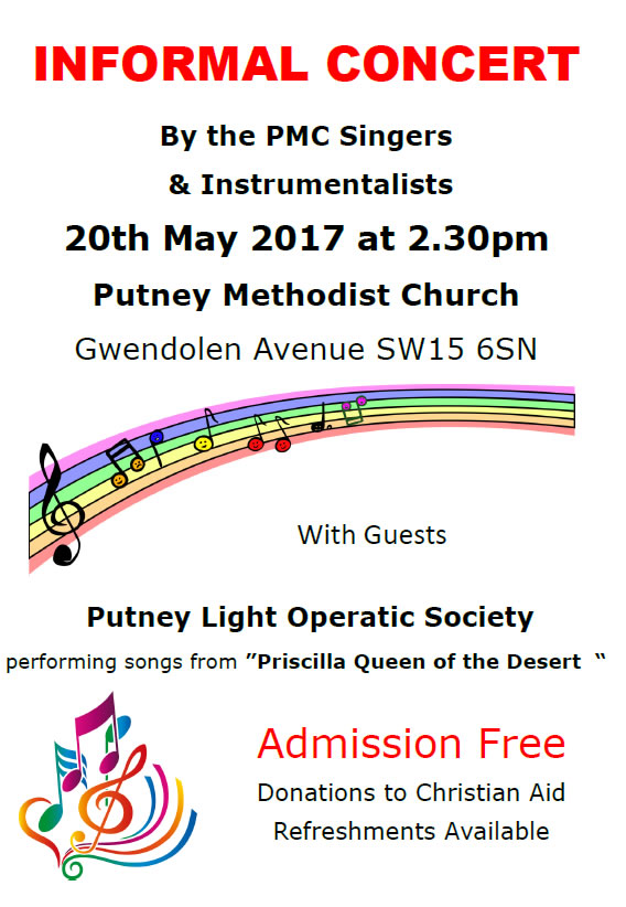 Concert by the PMC Singers and Instrumentalists with guests the Putney Light Operatic Society singing songs from their upcoming musical Priscilla, Queen of the Desert.