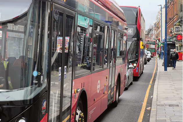Buses stuck in traffic in the centre of Putney