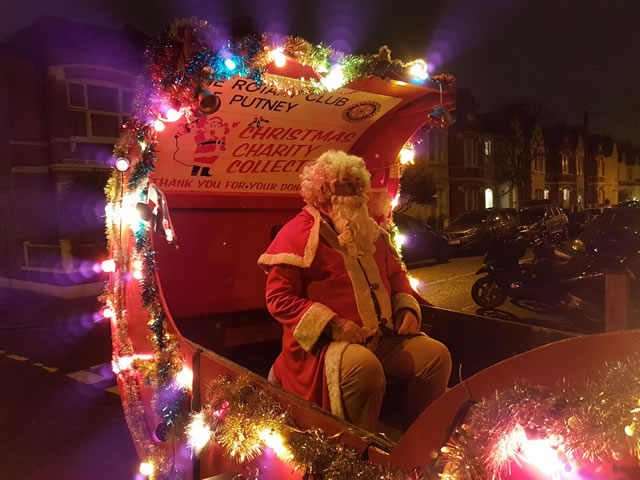 Continuing a tradition of over 40 years, the volunteers from the Rotary Club of Putney will once again bring Father Christmas and his sleigh to the streets of West Putney in December 2017. The team will going door to door to collect donations, and residents can come out and see the sleigh with Father Christmas on board - look out for the flashing lights and listen for the Christmas music! We will be out collecting between 6-9pm on the following nights*: This year the sleigh has been refurbished and now features the following enhancements: The Christmas Collection nights are the biggest fundraiser of the year for the club and the funds raised mean the club can support local and international causes. Funds raised last year contributed to the Defibrillator installed at the Putney Exchange centre, and for fitness equipment provided to the local Salvation Army. The club also contributed to the Rotary Foundation to support the “End Polio Now” initiative. Our members recall stories of residents coming out with flower pots of small change collected throughout the year in anticipation of our collection; and parents bringing out their young children to see Father Christmas - when they remember seeing the Rotary Christmas Float with their parents as youngsters decades before! This year the community can get a selfie with the sleigh and share with hashtag #PutneyRotary Putney Rotary Club President Barry Rowe remarks: “We would like to thank our local Putney community - who have been supporting our popular Father Christmas float collections over the years - it’s great fun, and a great fundraiser” The planned route* is detailed online. * These are the planned nights and routes, but operation of the sleigh is subject to weather conditions and safety advice from the police and other authorities |