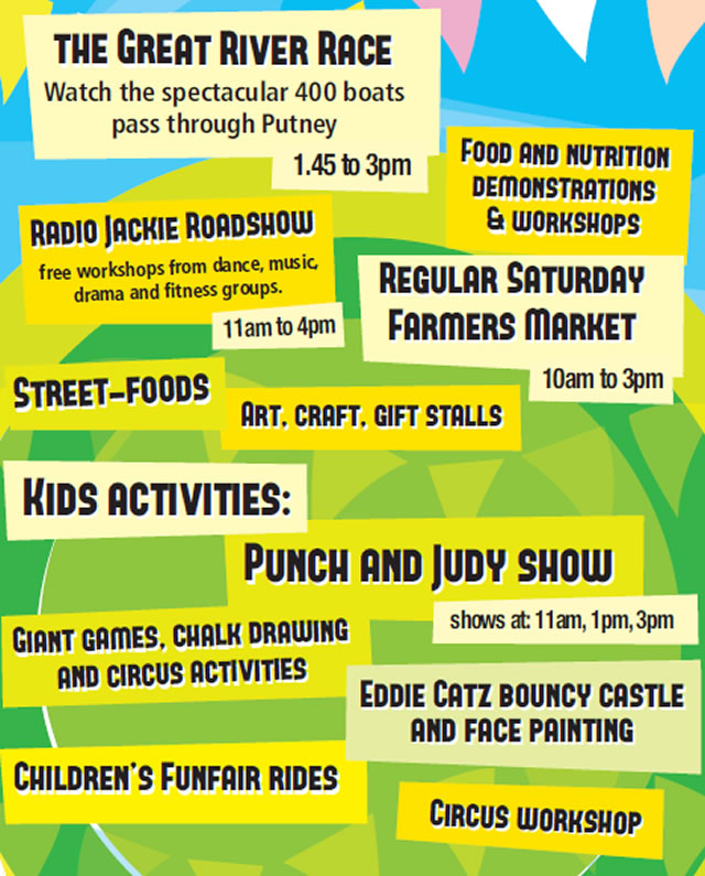 Nicola Grant, Putney Town Centre Manager says: " Come along and enjoy the beautiful Putney riverside at the Totally Thames Putney Party. Lots to do for everyone to enjoy themselves, regular Putney farmers market, lots of children activities and free workshops, nutrition advice, Radio Jackie Roadshow and can watch the 400 boats come past in the Great River Race. It is set to be a fun day out, so come along from 10 until 4pm in Church Square and Putney Wharf."