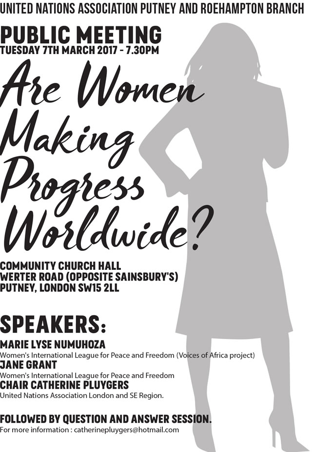 A meeting of the Putney and Roehampton branch of the United Nations Association entitled 'Are Women Making Progress Worldwide?' is to take on 7 March at 7.30pm. The speakers are Marie Lyse Numuhoza, Women's International League for Peace and Freedom (Voices of Africa project) and Jane Grant, Women's International League for Peace and Freedom. The meeting will be chaired by Catherine Pluygers of the United Nations Association London and SE Region. The talks will be followed by a Question and Answer Session. The event takes pace in the