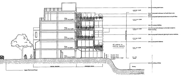 Councillors have approved plans for a five-storey office block extension in Putney. The feedback from the commitee was that "the scheme would provide additional modern office space in the town centre." The development at the rear of 266-276 Upper Richmond Road will increase the overall floor area by 865 square metres. Planning impressions below: