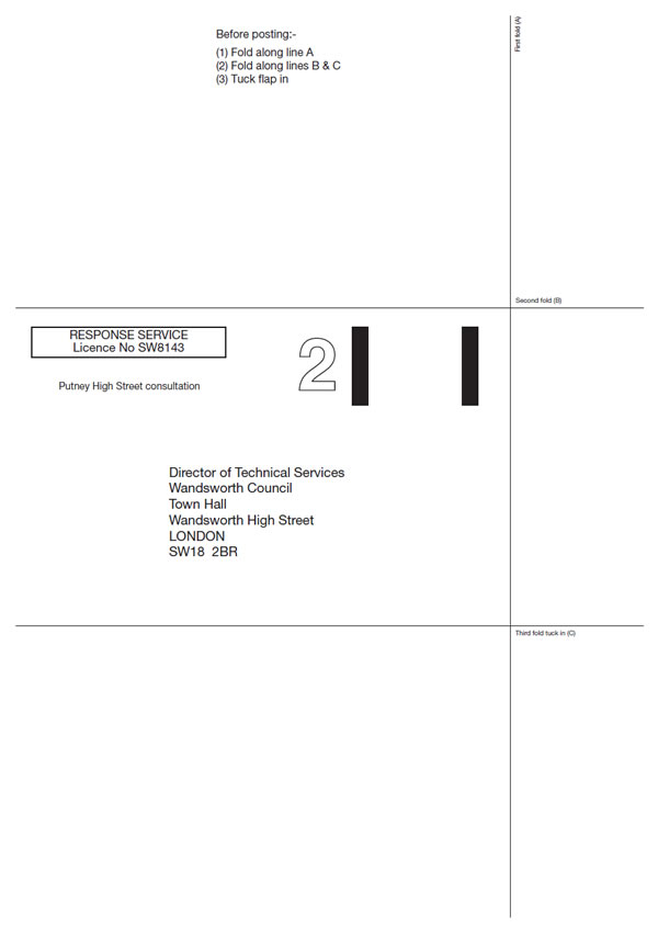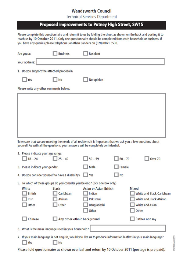 **The council will not accept any questionnaire forms that are not from residents or business owners directly affected by the scheme from 150 to 176 Putney High Street & (202 Upper Richmond Road); however, they welcome any feedback or suggestions, in the form of email, letter or a phone call from residents, businesses or other interested parties outside of the consultation area.