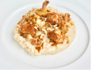 With the addition of hazelnut butter to give creaminess and toasted hazelnuts for a crunchy nutty taste, the layers of flavours building up on the palate add an extra dimension. This makes the perfect background for the delicate sweetbreads