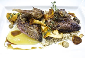 Roast grouse breasts, confit legs,peverada, barley and girolle mushroom risotto, fig compote