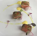 I opted for the most amazing starter I have had for quite some time - salmon rolled in basil and then filo pastry and then quickly cooked on the plonchette (which Emil assured me was a posh name for an expensive griddle!) resulting in a crisp pastry with juicy basil and succulent raw salmon. Tastebuds were amazed and it is very pretty to the eye, with vibrant colours and micro herbs and keta (salmon caviar).
