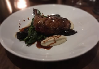The main courses arrived; my friends shrimp burger (£16) came with fries which were really hot and not at all greasy, and topped with a fiery 'mayonnaise' and my guinea fowl melted away from the bone and was served with a rich prune and madeira jus with cauliflower puree and green beans(£18).
