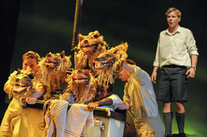 You don't need to bring a child who has read The Butterfly Lion with you to see the stage production, but it helps. The adaptation of the award-winning writer Michael Morpurgo’s inspiring tale of enduring friendship is a firm favourite with young children and my ten-year old daughter Holly was no exception. The novel tells the story of Bertie (Adam Buchanan) who adopts a white lioncub while growing up on a farm in Timbavati, South Africa. We follow his story through boarding school in England and then to the Front Line in France as a soldier in the First World War when he tries to find the White Lion who has been sold to a circus. Bertie's story is told by his childhood friend Millie played by Gwen Taylor (Coronation Street, Heartbeat) who brings her years of theatrical experience to the narration and is a central character on the stage. Former Children’s Laureate Michael Morpurgo was catapulted onto the world stage in 2007 with the National Theatre production of his book War Horse. The show has been a major hit in the West End, on Broadway and was filmed by Steven Spielberg. It's difficult for the cast in The Butterfly Lion to replicate the stunning puppetry of War Horse, but they do a sterling job, although my young companion did complain that using toy animals to replicate the scene at the waterhole was not as exciting as it might have been if the actors had used larger puppets or wore animal costumes. However they do this on other occasions including the scene (pictured below) where a pack of hyenas try to kill the orphaned lion-cub.