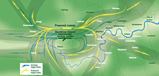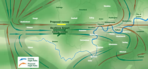 New flight maps have been published in an attempt to alert the areas likely to be affected by noise from the third runway. The maps (see below) produced by the 2M Group of local authorities shows how new flight paths could bring disturbance to communities on all sides of the airport. Aircrafts approaching the third runway are likely to use a number of paths over north London before beginning their final descent over Kensington, Chelsea, Hammersmith, Chiswick and Brentford. The 2M Group represents more than two million people concerned about the environmental impact of Heathrow expansion. Speaking on their behalf, Hammersmith and Fulham Council leader Stephen Greenhalgh said, "The maps show just how few parts of the capital will be able to escape the effects of a new runway. In west London where all the flight paths come together the consequences could be devastating. The Government has not thought through the environmental consequences of allowing unrestrained growth at Heathrow." The Government is expected to give the go ahead in April for the third runway. Ministers could claim that nitrogen dioxide levels at Heathrow can be reduced to EU-acceptable levels by siting new airport car parking to the north of the M4, just inside the M25. The 2m Group say that even areas not directly affected by the third runway will suffer. They are expecting ministers to include proposals for ending the current practise of runway alternation, which gives relief to communities during the day when aircraft switch runways at 3pm. By allowing aircraft to land and take off in parallel from the two existing runways the Government hopes to give the airport an immediate boost in capacity before the third runway opens in 2015. Wandsworth Council leader Edward Lister explained, "The loss of runway alternation would be felt particularly keenly in south and west London. At least under the current system you know you will get a break from the noise. If the Government gets its way there will be no respite during the day." Heathrow's capacity is capped at 480,000 movements a year. The limit was imposed as part of the Terminal Five planning permission. Ending runway alternation could take this figure up to 515,000, rising to 650,000 if a third runway were approved. If both runway alternation were ended and a third runway built the number of flights each year at Heathrow would rise to more than 700,000.