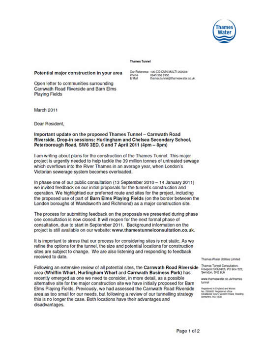 MP Secures Extension To Thames Tunnel Consultation Justine Greening MP Holds Thames Tunnel Public Meeting Thames Tunnel - A Message to Concerned Residents From Cllr Edward Lister Wandsworth Council Says NO To Barn Elms Tunnel