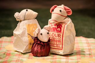 It’s a sophisticated mix of movement, music , dance, mime, puppetry – and cake making ¬– that must test every sinew of the actress. It results in small children, with eyes as round as saucers, unconsciously leaning into their parents and grandparents sides, as the brave mice (in reality no more than piping tubes or flour bags but, in imagination, characters ranging from the bright and bouncy to to downright timorous !) face down their fears in order to have a good time. It’s fascinatingly skilful to watch.
