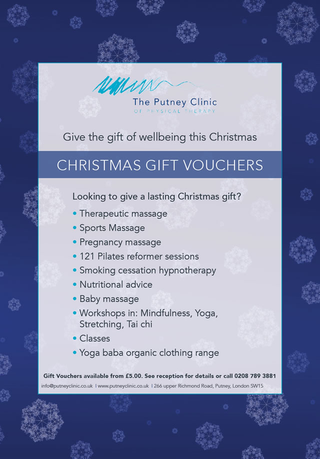 Give the gift of wellness this Christmas. Vouchers available from £5 onwards. On sale at reception at The Putney Clinic of Physical Therapy or by calling 020 8789 3881. December 14, 2017 |